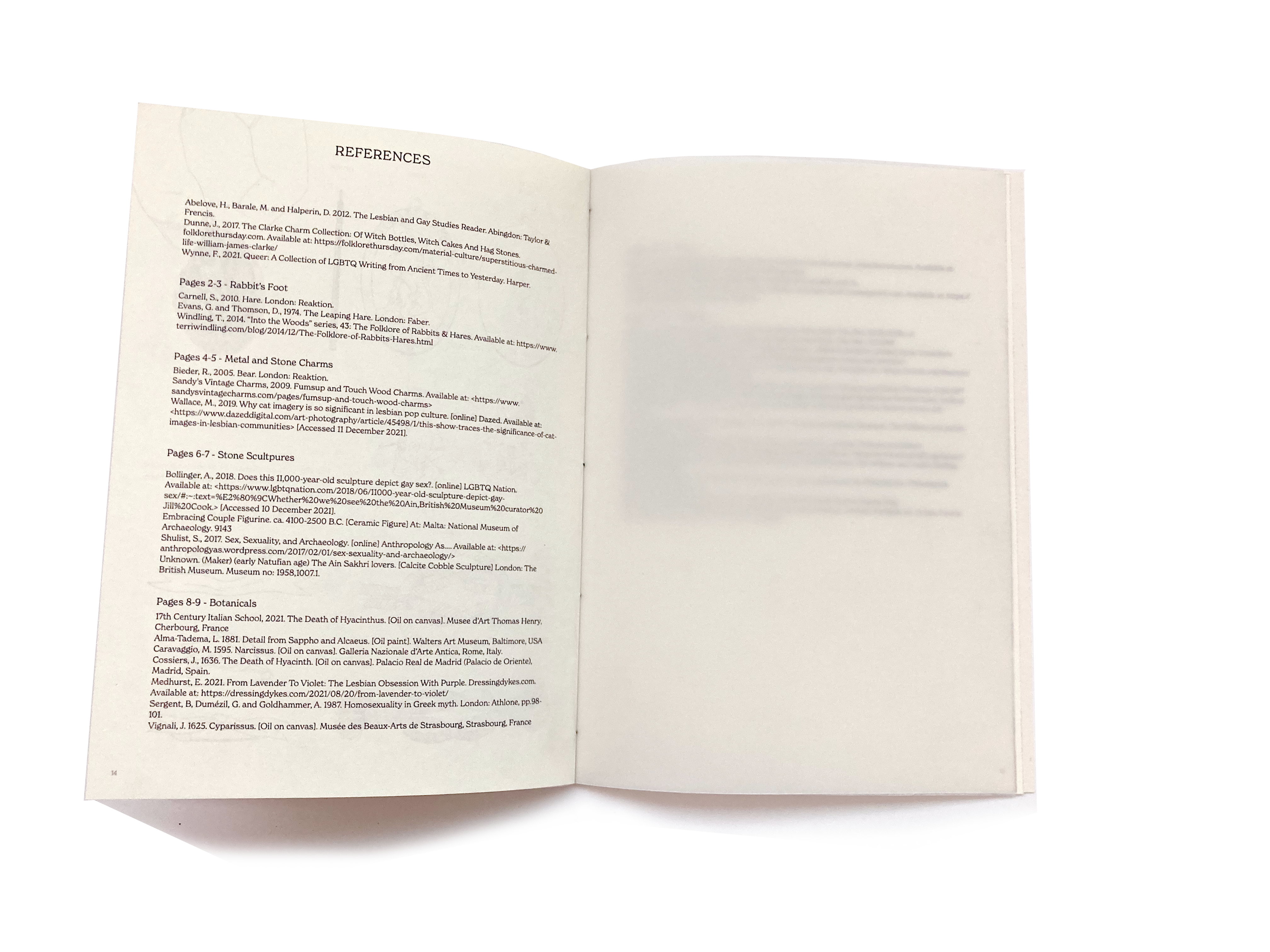 I began to research luck tokens, amulets and talismans; hag-stones, touch-wood poppets and rabbit feet. Through my investigation into queer history and mythology; I found a lot; the most homoerotic saint, the proudest coin and how to distract the devil with hand gesture. I also looked into the visuals of archaeological and scientific illustration, where I found a real beauty to how refined the observations are, as well as the interplay of text on the page. Using this I went back into their history, then rerooted their recipes to produce new outcomes through the lens of queerness.
