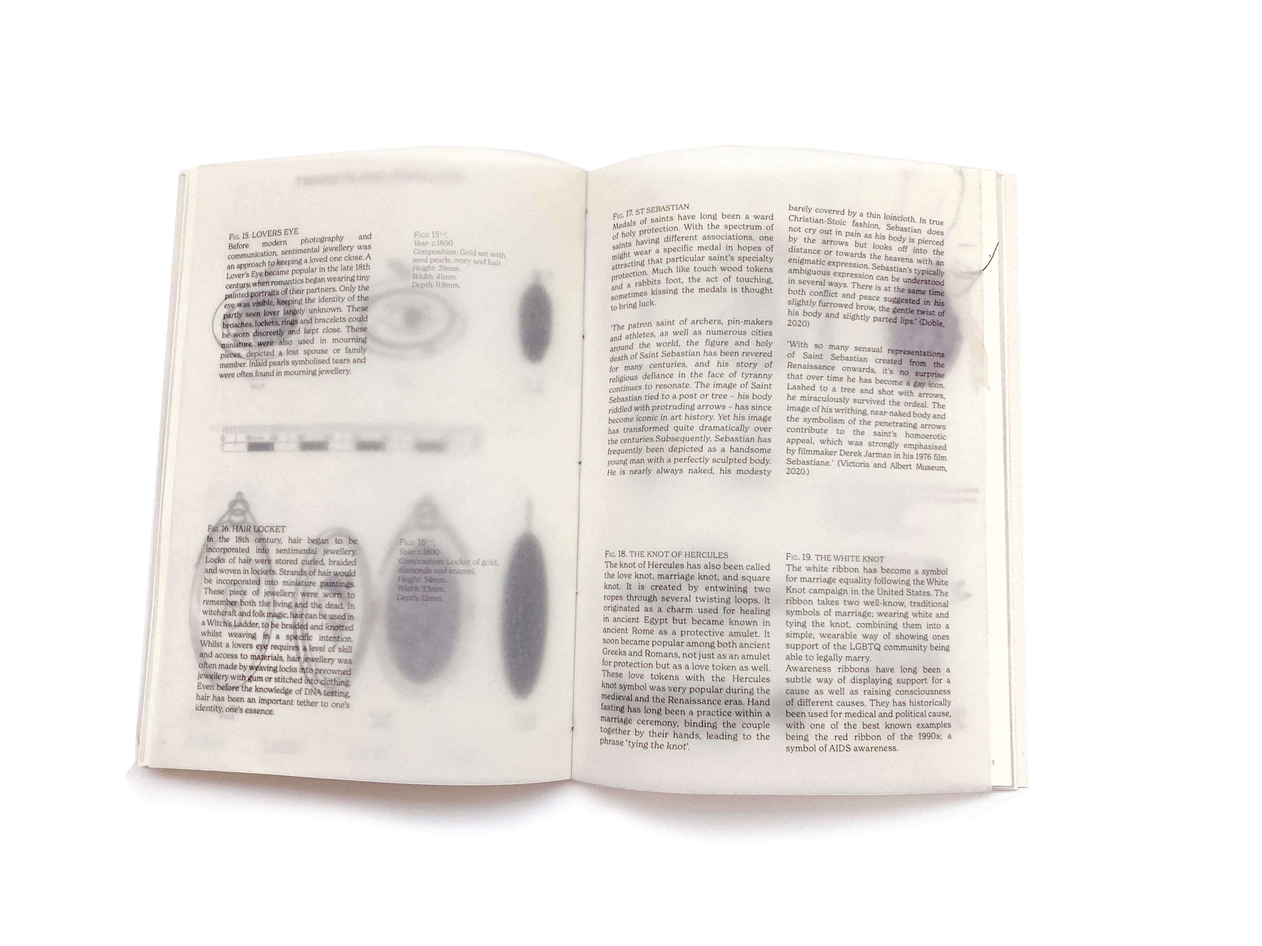 I really wanted to work in the pages of tracing paper and a physical sense to re-view the items, overlaying hands to show how the item might be held. A lot of these items are activated through touch, a knock to wood, a kiss to a saint. There’s a real physicality to these items, we imbue them which such power, superstition. It’s an incredibly intimate thing, so often these things are found, passed on or gifted. They’re treasured. It also asks the audience themselves to interact with the item, turning to pages, lining up the gestures.